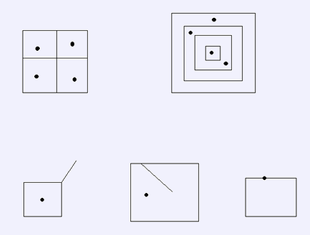 例如上图中第一行的数据是合法的。而第二行中的数据都是不合法的。左边的那幅图包含线段两侧都是空白区域;中间的图包含线段两侧区域同时属于同一个国家;右边的图中军队被布置在了国界线上,因此非法;此外若最右侧的图中若没有军队也是非法的。保证输入文件提供的数据都是合法的,你的程序不需要进行数据合法性的判定。