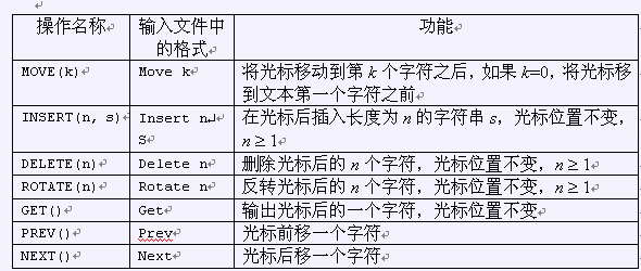 对输入数据我们有如下假定: MOVE操作不超过50 000个,INSERT、DELETE和ROTATE操作作的总个数不超过6 000,GET操作不超过20 000个,PREV和NEXT操作的总个数不超过20 000。 所有INSERT插入的字符数之和不超过2M(1M=1 024*1 024)。 DELETE操作、ROTATE操作和GET操作执行时光标后必然有足够的字符。MOVE、PREV、NEXT操作不会把光标移动到非法位置。 输入文件没有错误。
