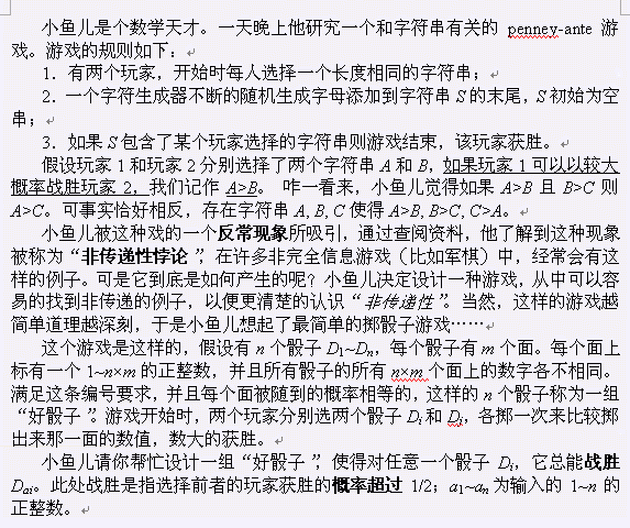 示例1:D1和D2比,D2和D3比,D3和D1比,前者获胜的几率均为5/9; 示例2:D1战胜D2,D2战胜D1 。矛盾!无解;示例3:D1和D2比,D2和D3比,D3和D1比,前者获胜概率分别为9/16, 9/16, 10/16;示例4:D1和D2比,D2和D3比,D3和D4比,D4和D1比,前者获胜的几率均为9/16。【数据规模】 30%的数据满足n, m≤10 100%的数据满足3≤n, m≤200