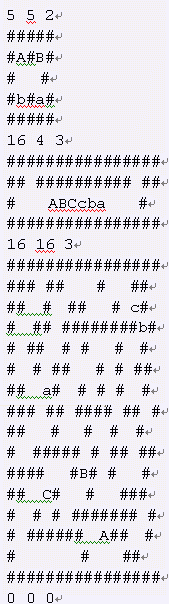 第一行给出W,H,N. 下面W行H列给出字符矩阵.