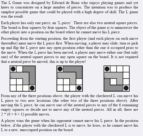 一个4*4的棋盘,放有两个L形和两个小圆球;其中一个L形被先手控制、另一个被后手控制。 两个人轮流走棋。一个人每一步可以将L形拿起然后重新放入棋盘中的任何新位置(不能放在原来的位置,可以翻转、旋转) 然后他可以选择任意一个小圆球移动到新的位置、也可以不移动小圆球,这由他决定。 一旦某人不能走了,就输了。输入一个状态,判断先手是必胜、必败还是平局。(假设两个人都足够聪明)