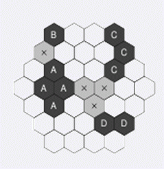 The input contains several scenarios. Each scenario begins with an integer number H , which specifies the size of the land, 2 H 20 . Then there are 2*H - 1 lines representing individual ``rows" of the land (always oriented as in the picture). The lines contain one non-space character for each parcel. It means the first line will contain H characters, the second line H + 1 , and so on. The longest line will be the middle one, with 2*H - 1 characters. Then the ``length" descends and the last line contains H parcels, again. The character representing a parcel will be either a dot (``.") for the land that is not owned by the investor, or one of the uppercase letters ``A", ``B", ``C", or ``D". The areas of parcels occupied by the same letter will always be connected. It means that between any two parcels in the same area, there exists a path leading only through that area. Beside the characters representing parcels, the lines may contain any number of spaces at any positions to improve ``human readability" of the input. There is always at least one space between two letters (or the dots). After the land description, there will be one empty line and then the next scenario begins. The last scenario is followed by a line containing zero.