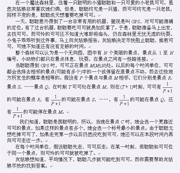 第一种是走到景点3,这样聪聪和可可到达同一个景点,可可被吃掉,步数为1,概率为 。