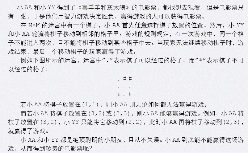 若小AA能够赢得游戏,则输出一行"WIN",然后输出所有可以赢得游戏的起始位置,按行优先顺序输出 每行一个,否则输出一行"LOSE"(不包含引号)。