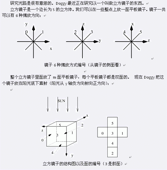 我们只考虑射向整点的光线,那么这样的光线一共有(s+1)*(s+1)条。这些光线经过一系列平板镜子的反射(如果没有镜子阻挡也是可能直接射穿的)之后最终会从立方镜子的某个面出来(上图已经将面编号,并给定坐标轴方向)。现在你的任务就是求每个面出来的光线条数以及这些光线的反射次数和。