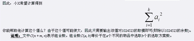 仅包含一行,即为 Sigma(Ai^2) i从1到k 除以1024523的余数。