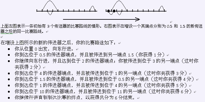 你可以将这些新传送器的端点设在任何位置上(甚至是非整数坐标点也可以),只要这些坐标点并不出现在已经被另一个端点占用的位置上即可。换句话说,所有传送器的端点位置必须是唯一的。同样,新传送器的端点都必须严格位于这条直线路线的起点和终点之间。