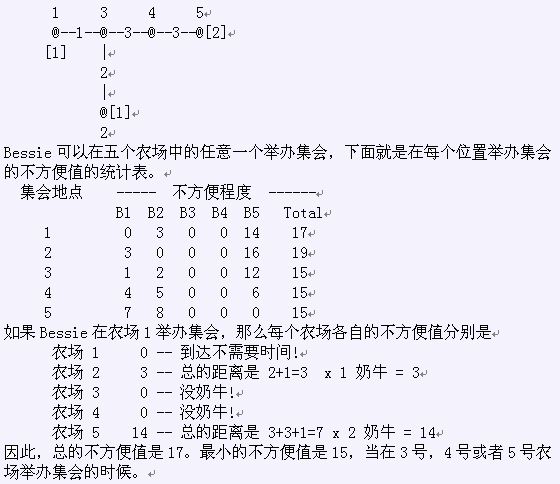 Bessie正在计划一年一度的奶牛大集会,来自全国各地的奶牛将来参加这一次集会。当然,她会选择最方便的地点来举办这次集会。每个奶牛居住在 N(1<=N<=100,000) 个农场中的一个,这些农场由N-1条道路连接,并且从任意一个农场都能够到达另外一个农场。道路i连接农场A_i和B_i(1 <= A_i <=N; 1 <= B_i <= N),长度为L_i(1 <= L_i <= 1,000)。集会可以在N个农场中的任意一个举行。另外,每个牛棚中居住者C_i(0 <= C_i <= 1,000)只奶牛。在选择集会的地点的时候,Bessie希望最大化方便的程度(也就是最小化不方便程度)。比如选择第X个农场作为集会地点,它的不方便程度是其它牛棚中每只奶牛去参加集会所走的路程之和,(比如,农场i到达农场X的距离是20,那么总路程就是C_i*20)。帮助Bessie找出最方便的地点来举行大集会。