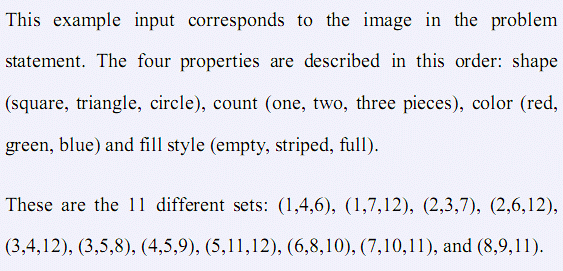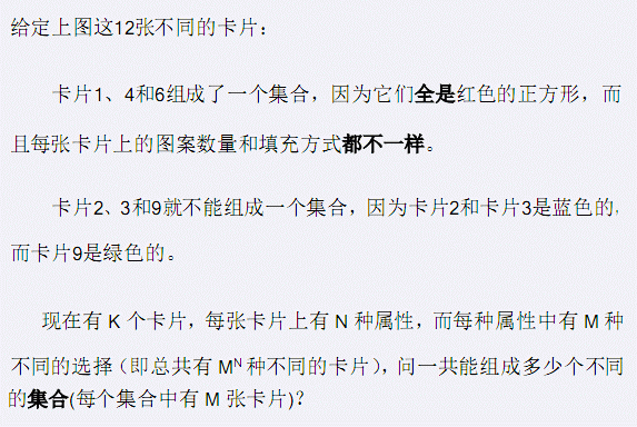 Each test case looks as follows: The first line contains three positive integer N, M and K giving the number of different properties of the cards, the number of different values of a single property, and the number of cards drawn.