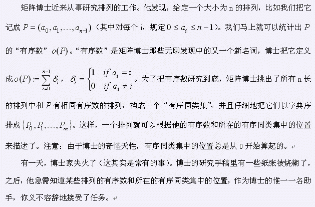 文件的第一行只有一个整数n(1≤n≤64),代表给定排列的长度。文件的第二行开始有n个整数,顺次代表一个排列,注意是排列中的元素是从0开始到n-1的。
