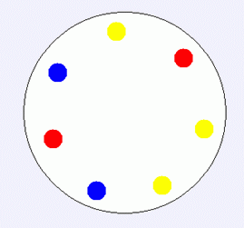 Constantine刚结束在MySky Island的度假,正准备离开的时候,他想送给她的好朋友YY一份特别的礼物——MySky Island上特别的手工艺品宝石纪念币。宝石纪念币的一面上刻着小岛的名字MySky,或者收礼物的人,比如”to YY”。不过特别的是,每枚纪念币的反面,依次均匀的镶着一圈共n颗彩色的宝石。例如,下面是一个n=7时的简单例子: