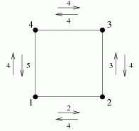 输入:第一行为两个用空格隔开的整数n(2<=n<=1000),m(1<=m<=2000),接下来读入m行由空格隔开的4个整数a,b(1<=a,b<=n,a<>b),c,d(1<=c,d<=1000),表示第i+1行第i座桥连接小岛a和b,从a到b承受的风力为c,从b到a承受的风力为d。