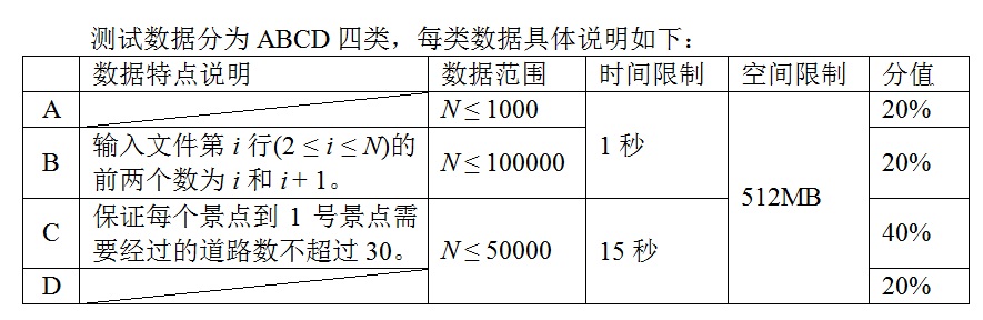 输入文件保证符合题目的约定,即任意两个景点之间都有且仅有一条路径相连。