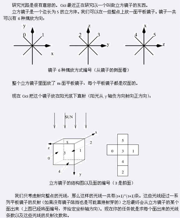 注:我们认为每个平板镜子都是无限薄的,即如果有一束光线从一个镜子的侧面射入,它会方向不变的射出。