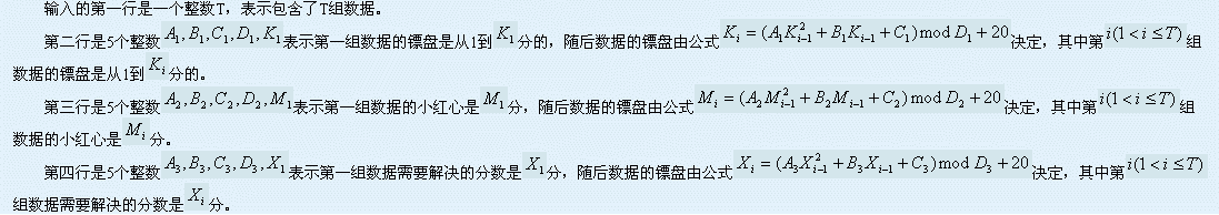1<=T<=1000000,20<=K1,M1,X1,D1,D2,D3<=10^9