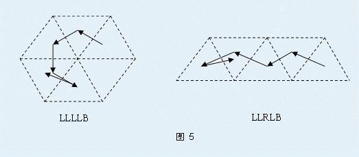 例如,假如原指令串为“LLLLB”,那么第1、4、6秒内A面是朝下的。此时,如果SECSA向你询问第3秒到第6秒的情况,你就应该回答“2”。而SECSA将第3条指令修改为“R”的话,指令串就变成了“LLRLB”,那么正四面体就只有在第1、5秒内A面朝下了。如图 5所示: