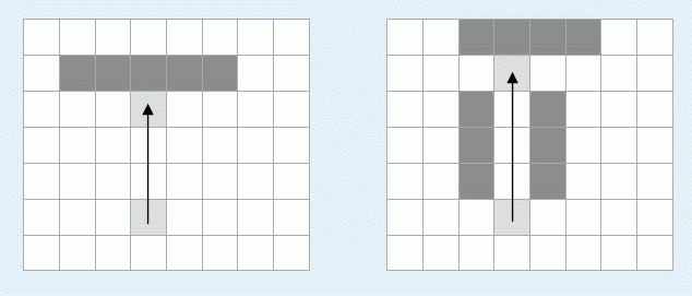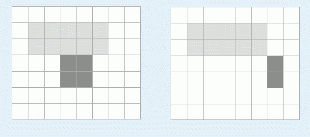 ACM探险队在经过多年准备之后决定在这个冰原上寻找遗址。根据他们掌握的资料,在这个冰原上一个大小为一格的深洞中,藏有一个由史前人类制作的开关。而唯一可以打开这个开关的是一个占据接近一格的可移动的小冰块。显然,在南极是不可能有这样小的独立冰块的,所以这块冰块也一定是史前文明的产物。他们在想办法把这个冰块推到洞里去,这样就可以打开一条通往冰原底部的通道,发掘史前文明的秘密。冰块的起始位置与深洞的位置均不和任何冰山相邻。这个冰原上的冰面和冰山都是完全光滑的,轻轻的推动冰块就可以使这个冰块向前滑行,直到撞到一座冰山就在它的边上停下来。冰块可以穿过冰面上所有没有冰山的区域,也可以从两座冰山之间穿过(见下图)。冰块只能沿网格方向推动。