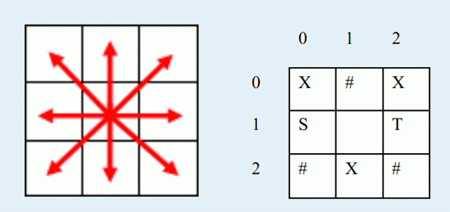 例,其中X表示炮塔,#表示障碍,有炮塔或障碍的格子喵星人都无法经过,在这张地图中喵星人从S走到T受到的伤