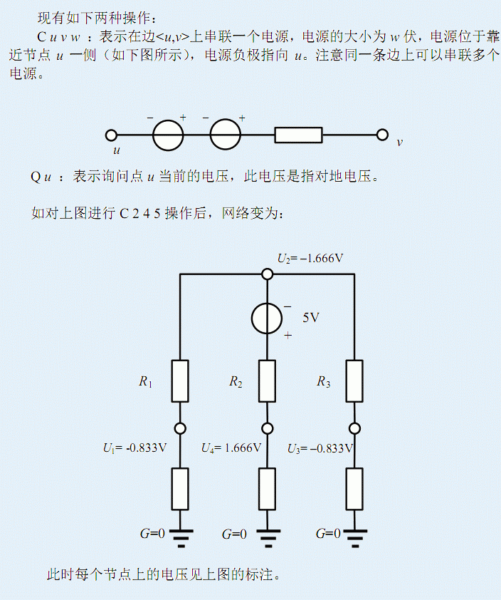 对于每个 Q 命令,输出一个数表示此刻该点的电压值。你可以输出任意多位的小数,只要你的答案和标准答案相差不超过10-3 就算 合法。