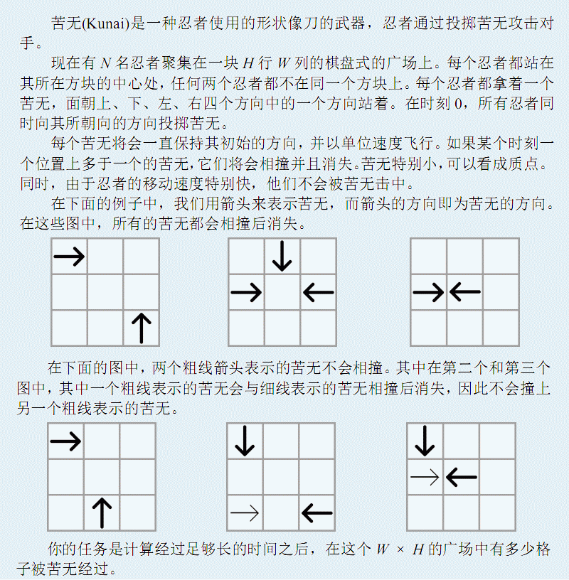 输出一个整数,表示经过足够长的时间之后,在这个 W H 的广场中被苦无经过被苦无经过的格子数量。