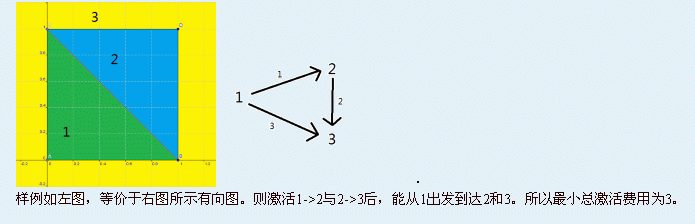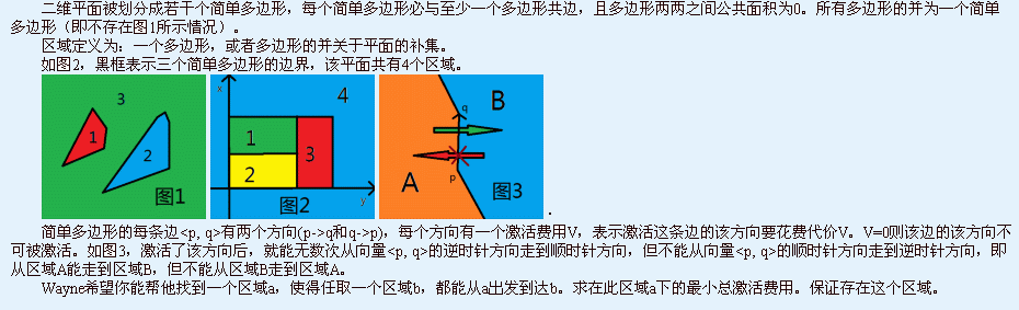 对于100%的数据,n≤3000,区域数不超过1000,点坐标绝对值不超过1W,每条边激活费用不超过100。