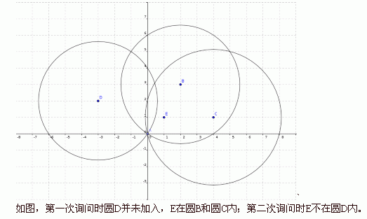 2.1 x y。表示询问点(x, y)是否在所有已加入的圆的内部(含圆周),且至少在一个圆内部(含圆周)。