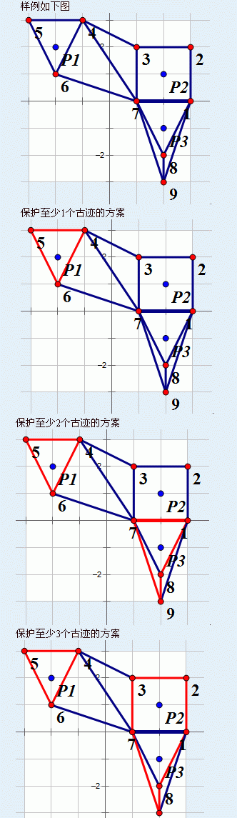 输出p行,分别表示将至少1个,2个,…,p个古迹围起来的最小花费。