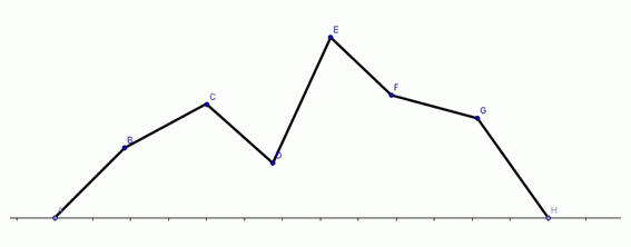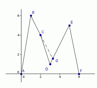 从D点出发时,看到的最高点是E,当步行至G点时,发现更高点B,转向后一直步行向B点。从其它点出发后都不需要转向。