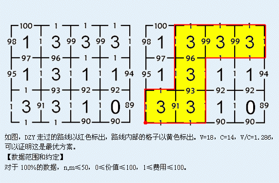 DZY喜欢在地里散步。他总是从任意一个格点出发,沿着格线行走直到回到出发点,且在行走途中不允许与已走过的路线有任何相交或触碰(出发点除外)。记这条封闭路线内部的格子总价值为V,路线上的费用总和为C,DZY想知道V/C的最大值是多少。