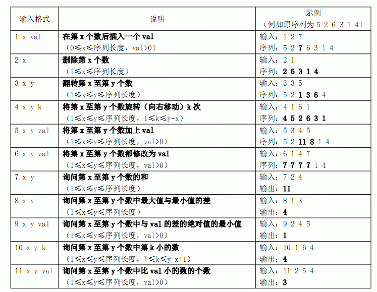 Jry最近做(屠)了很多数据结构题,所以想 BS你,他希望你能实现一种数据结构维护一个序列: