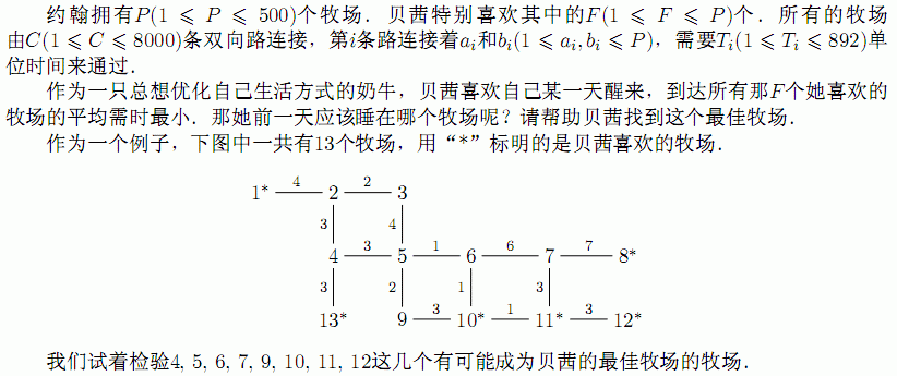 第1行输入三个整数P,F C.之后F行每行输入一个整数表示一个贝茜喜欢的牧场.之后C行每行输入三个整数ai,bi,Ti,描述一条路.