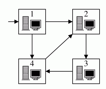 接下来M行每行两个数表示每条连接线的出发计算机和接收计算机的编号。