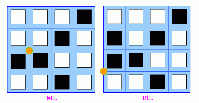 “动子”在网格线上运动时,从一个顶点A到相邻的另一个顶点B之后,以网格线AB为边的两个或一个网格上的方块就会翻转——白变黑,黑变白。例如图一的“动子”向右移动一步之后变成图二,向下移动一步之后变成图三。