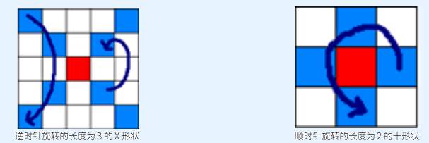 目录哥最喜欢和 XYF 玩了。但是目录哥发现 XYF 被邪恶的DBJ 给抓走了。于是目录哥开始了英雄救美的旅程。目录哥通过自己高超的黑客技术,探明 XYF被关在了吉萨金字塔群底下(坐标:29°58′43.41″N 31°8′5.06″E)。于是目录哥带上了神犬扎昆,带上军需官巨胖,坐上猴猴猴家开的泛埃及航空公司的飞机,前往埃及。到达吉萨金字塔群底下后,目录哥发现一个由 T 层棋盘组成的塔状结构,初始时目录哥在塔顶,而 XYF 在塔底。对于每一层棋盘,目录哥都需要把下一层的钥匙移动到自己手上,才能进入下一层.对于每一层棋盘,目录哥以自己所在的格子为中心(0,0),在每一层上建立了平面直角坐标系,而下一层的钥匙在(X,Y)处。现在的任务就是使用各种咒语,将下一层的钥匙移动到目录哥手上。可是由于记载咒语的石板年代太久远了,石板上的字由于风化而有所磨损,所以目录哥现在能看清楚的只有 X 咒语和十咒语。每念一次咒语,可以选择某坐标格为中心,扩展出一个长度为 L 的 X 形状或者十形状,并且顺时针或者逆时针旋转 90 度,每个格子上的所有物品会被一起旋转。详细描述如图,红色格子为中心,4 个方向扩展出的格子数包括中心格子为长度,箭头表示物品的转移路径。