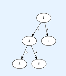 在神秘的东方有一棵奇葩的树,它有一个固定的根节点(编号为1)。树的每条边上都是一个字符,字符为a,b,c中的一个,你可以从树上的任意一个点出发,然后沿着远离根的边往下行走,在任意一个节点停止,将你经过的边的字符依次写下来,就能得到一个字符串,例如: