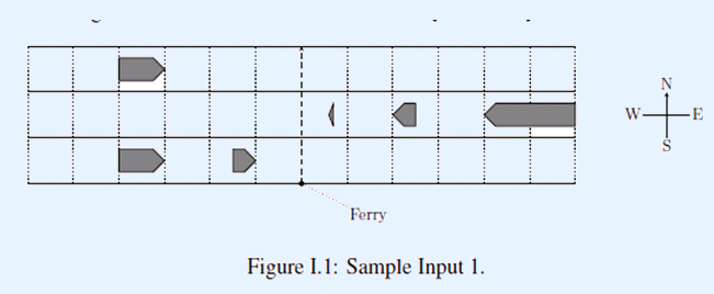 这里的位置是相对于穿越线而言的,坐标为负则在穿越线的西边,坐标为正则在穿越线的东边。每条航道上的船不会接触或重叠,并且每条航道上的船按坐标的升序给出。相邻航道之间紧邻,并且我们从南到北给出每条航道的信息。我们假定初始时轮渡在第一条航道的南端。所有航道上船的总数m不超过100,000。