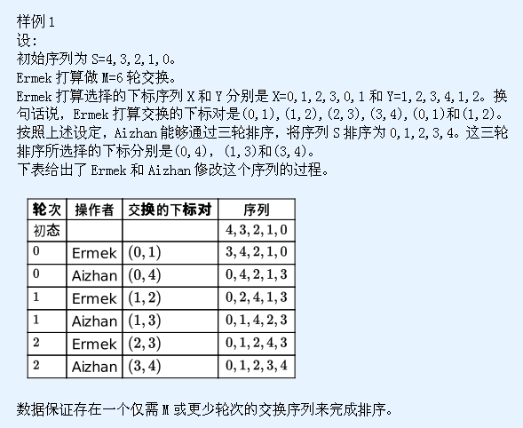 Ermek和Aizhan打算通过若干轮次来修改这个序列。在每一轮,Ermek首先做一次交换,然后Aizhan做另一次交换。更确切地说,做交换的人选择两个有效的下标并交换这两个下标的元素。请注意这两个下标可能相同。如果它们相等,则对这个元素自身做交换,并不改变这个序列。