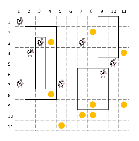 接下来n行每行两个数x,y,表示在(x,y)处有一头牛。