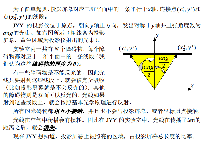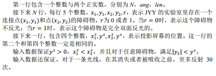 0 < = N < = 10, 0 < ang < = 150, 0 < Len < = 1000, 并且任意输入坐标的绝对值不超过 1000。