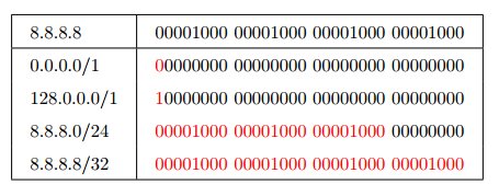 上表将地址均转为二进制串,并用红色标记出待比较的位(由掩码长度决定)。将红色部分与