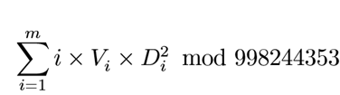 现在小 C 想知道,假设 1 号结点的权值有 m 种可能性,权值第 i 小的可能性的权值是 Vi,它的概率为 Di,求: