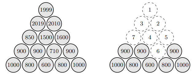 接下来n行,第i行i个正整数a[i][1],a[i][2],...,a[i][i](1<=a[i][j]<=2019),表示从上往下第i行从左往右第j个数。
